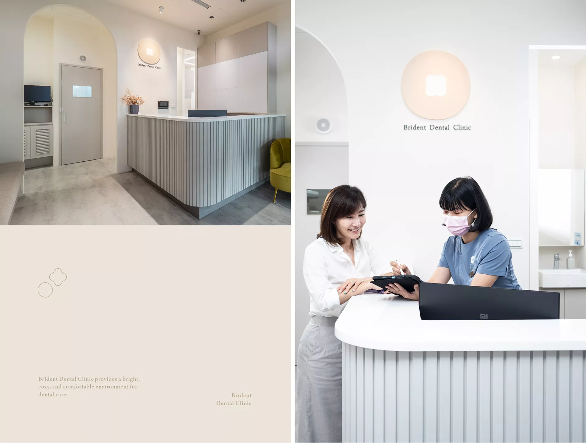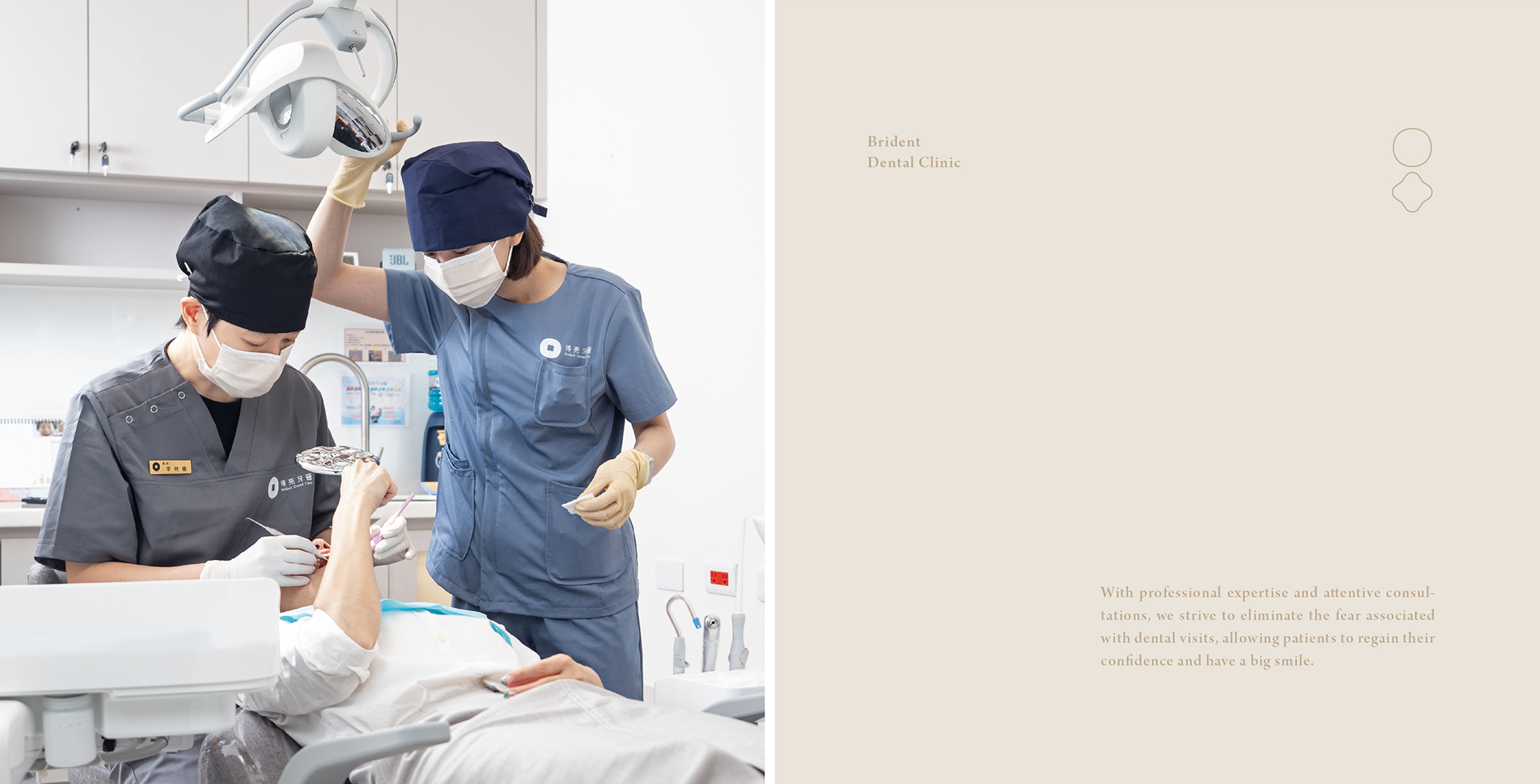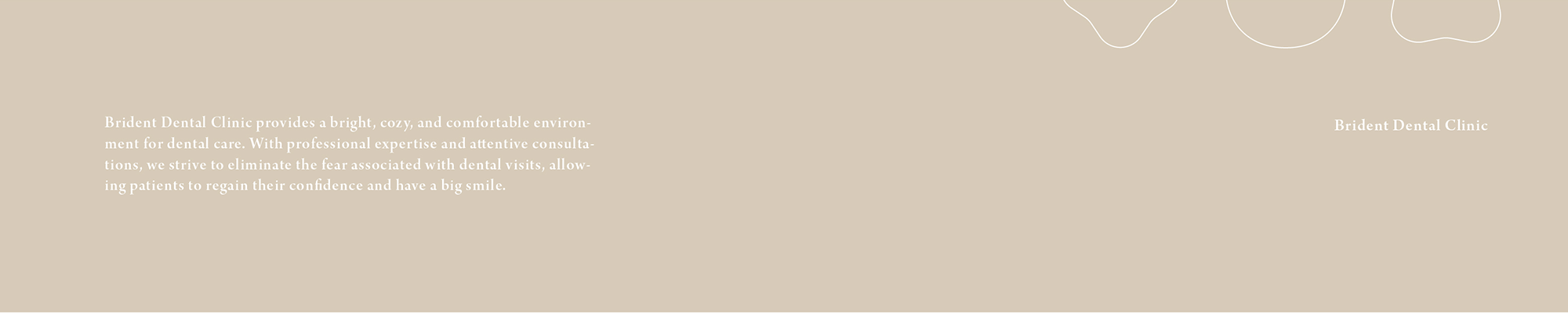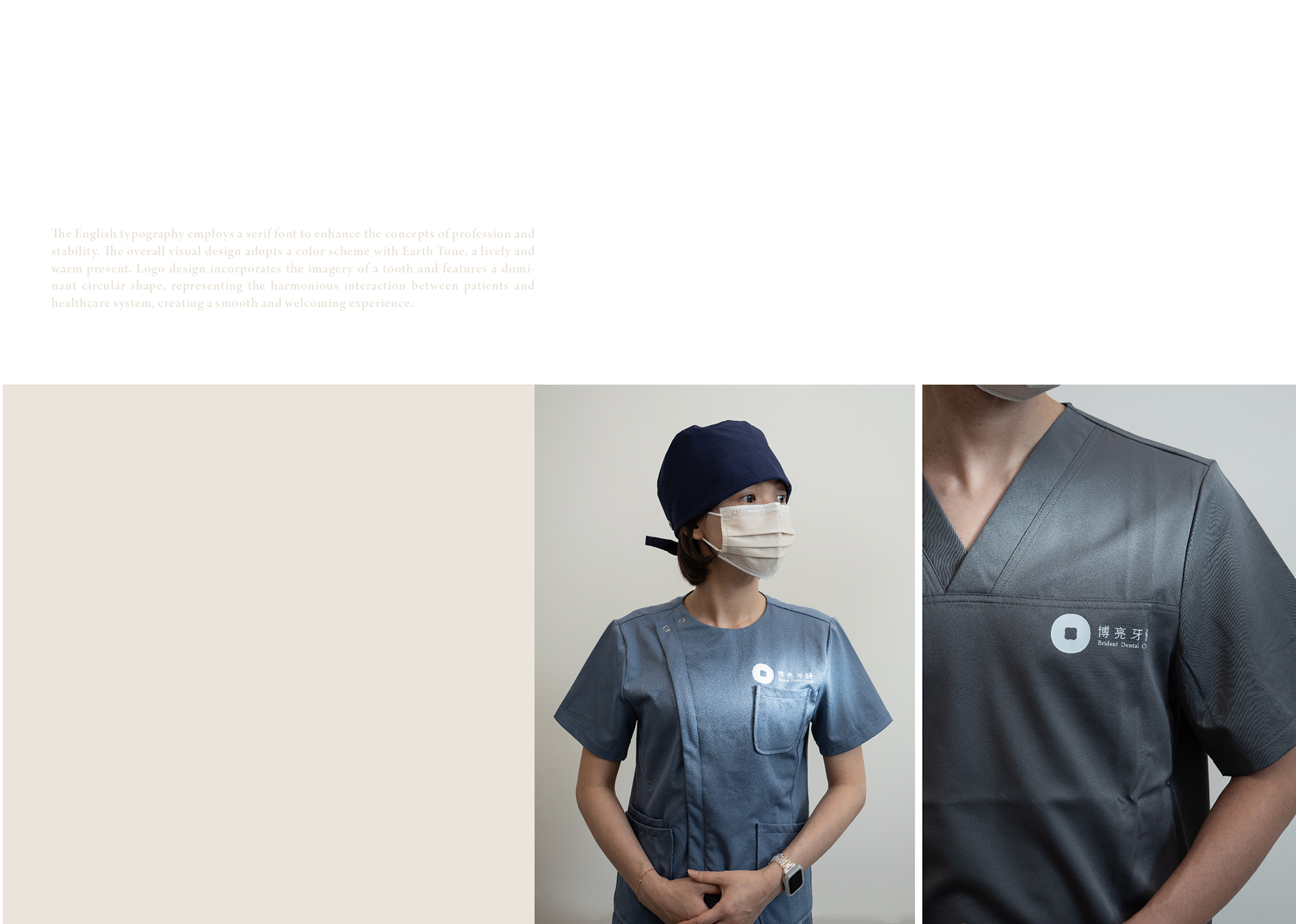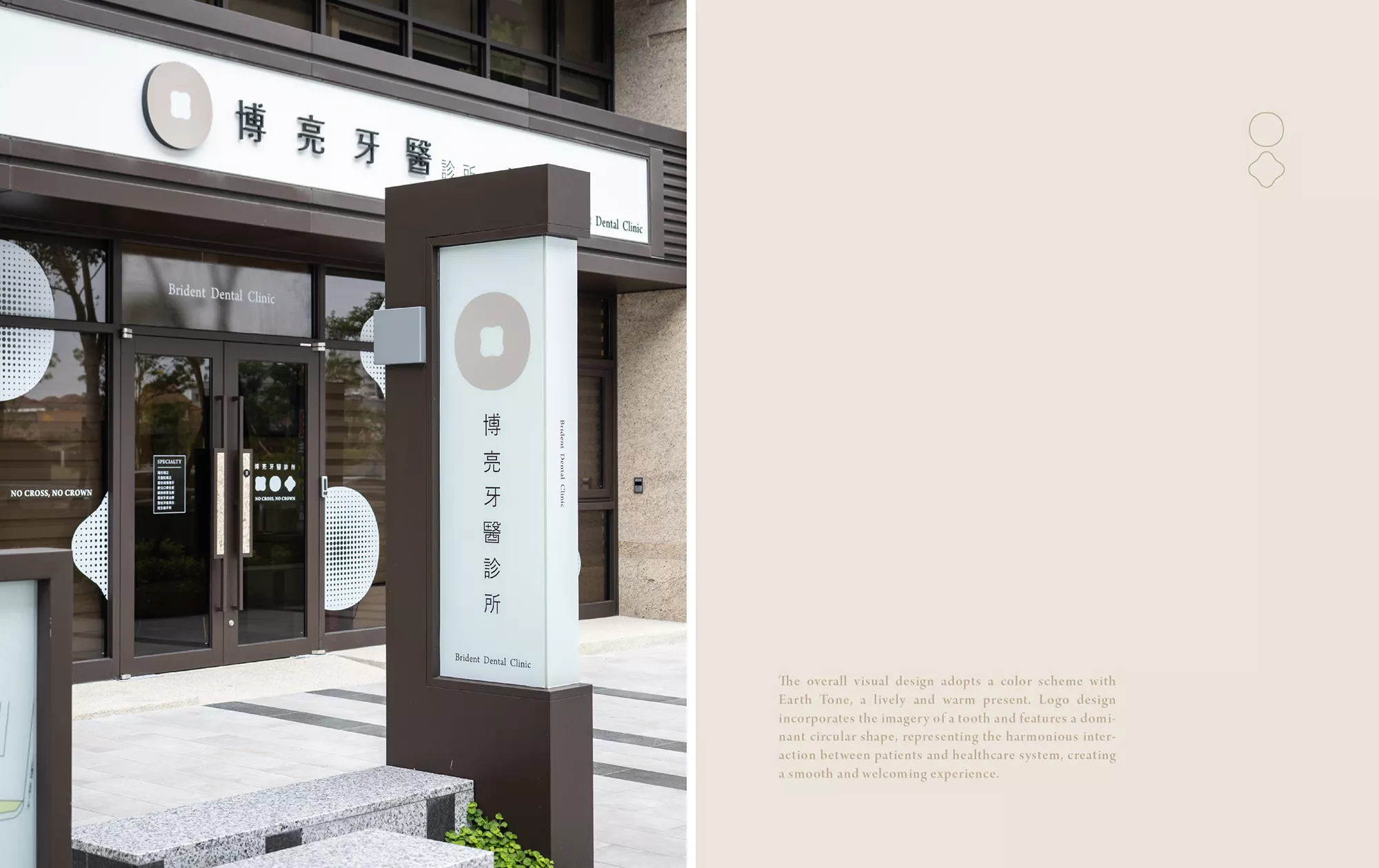 However, we value your feelings and have moved beyond the standardized dental procedures. With our professional expertise and attentive consultations, you will feel warm and no longer have the fear of dental visits. Our team constantly communicates and discusses, refining our skills and knowledge to ensure that every patient’s dental problems are effectively resolved. Here, you will no longer be haunted by lingering fears. Every corner is filled with warmth and kindness. Our only desire is to give you healthy and bright teeth, restoring your confident smile.The overall design adopts a natural color palette, presenting a lively and warm ambiance. The dental imagery used as motifs intuitively reflects the essence of the establishment, and the colors exhibit a welcoming atmosphere. The English font choice employs a serif typeface, enhancing the concepts of professionalism and stability. The overall visual theme revolves around circles, symbolizing the positive interaction between patients and the healthcare system—smooth and friendly.”