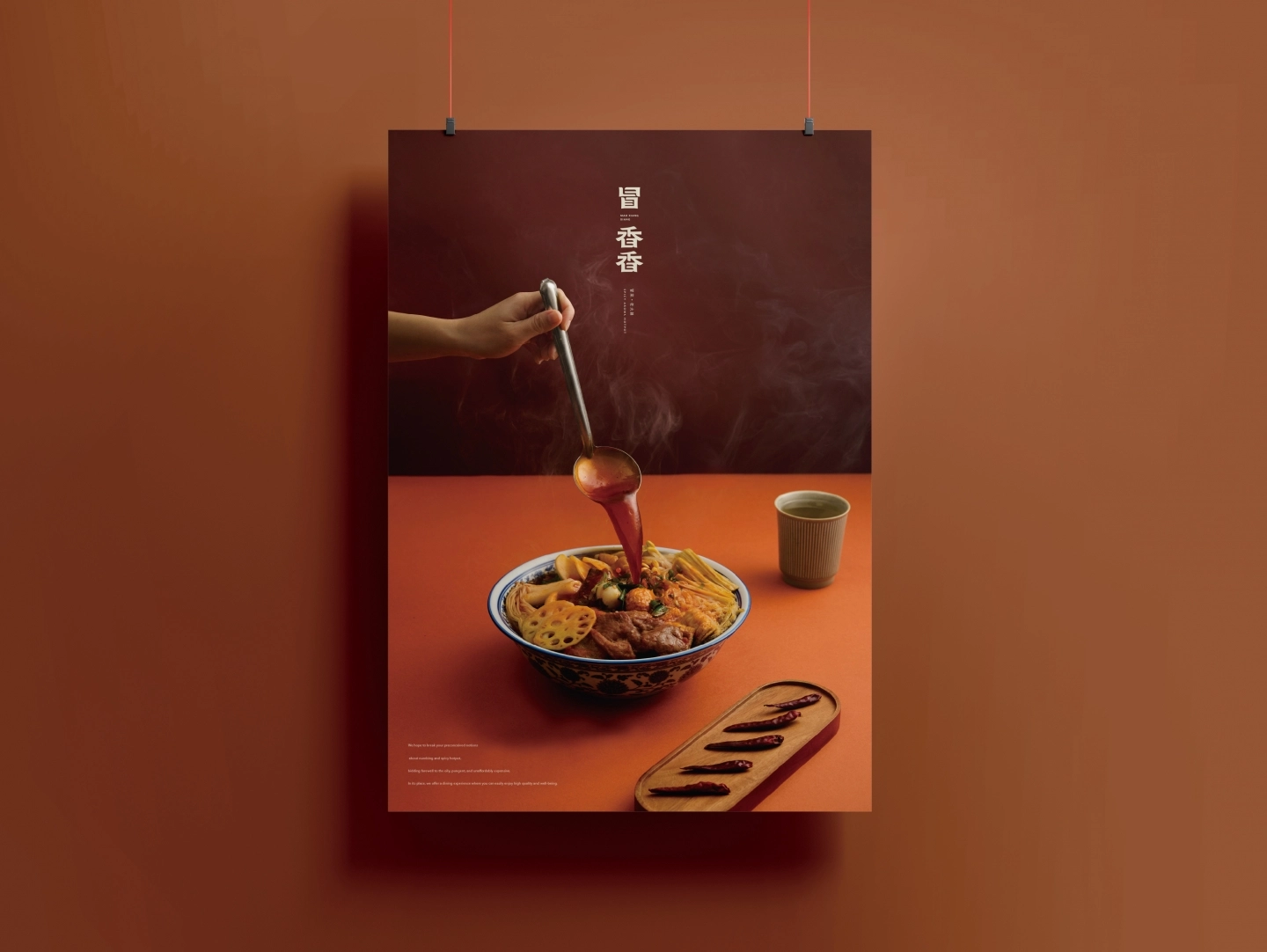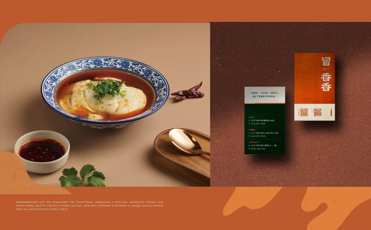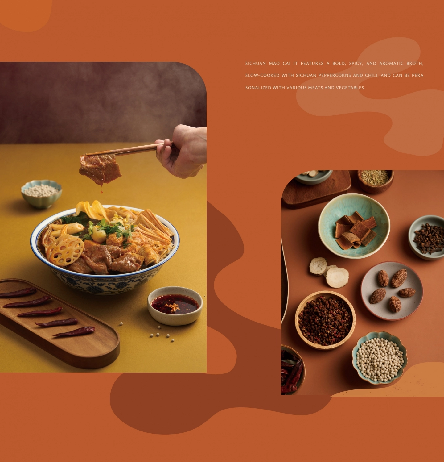 花椒的微麻提醒著勇氣,辣椒的熱烈喚醒了激情,而在香氣與滋味的縫隙裡,我們希望留下的,是一份真誠的溫度。 品牌的設計理念,以「溫暖、自然、堅持」為核心色調:橘色如湯底的熱烈,深綠象徵食材的真實,米色如蒸氣般的輕盈,帶來安定與自在。這些色彩不是隨機的搭配,而是一種情感的調和。字體設計以升騰的蒸氣為靈感,讓文字本身也散發出香氣的流動。 攝影的語言,也承載著同樣的思考。