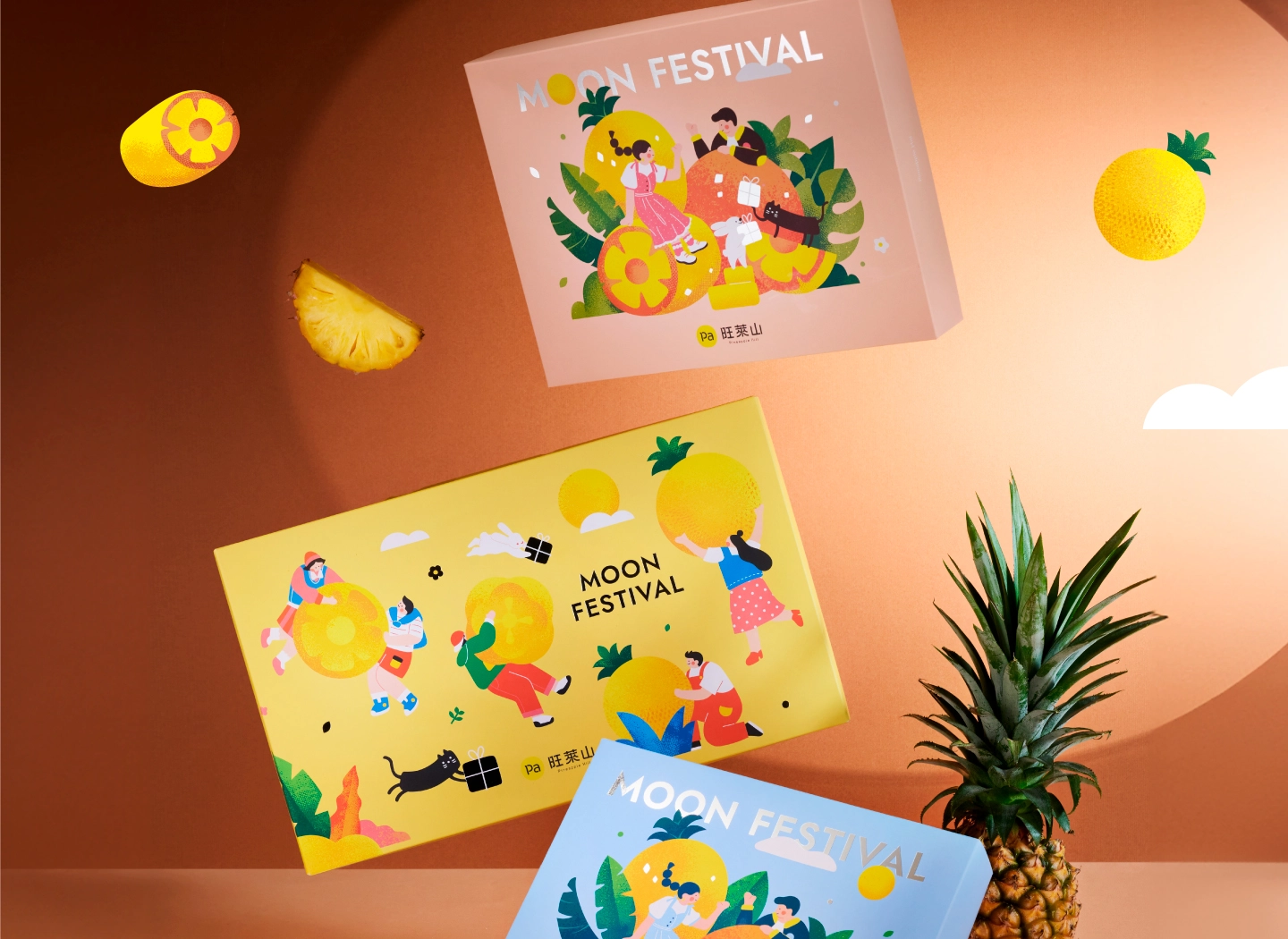中秋禮盒以「祝福被分享的那一刻」為核心概念,將中秋從單一節慶符號,轉化為一場關於陪伴、交換與情感流動的日常風景。視覺以鳳梨作為主角,結合月亮、雲朵、兔子與禮物等意象,象徵豐收、圓滿與心意的傳遞,讓祝福不再停留在語言,而是被看見、被觸摸、被收藏。
