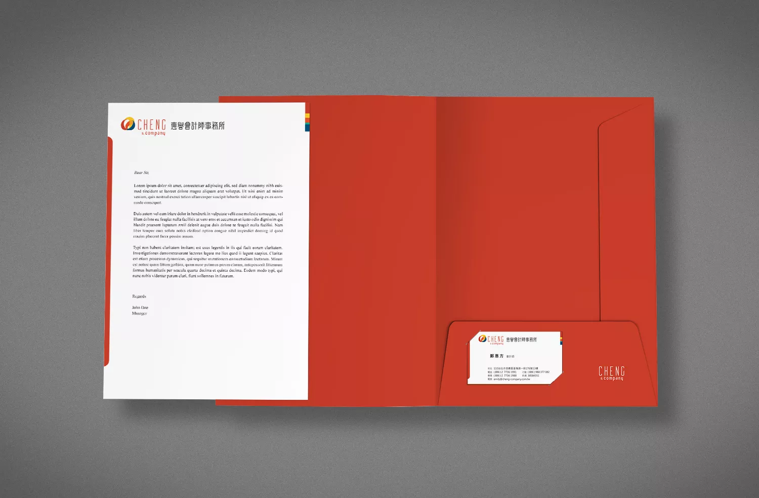 品牌識別採用會計師的姓氏作為名稱,主要色調選用具少見的朱紅色,別於一般事務所帶給人理性的既定印象。傳達出自信與熱忱的企業精神。並以字首C為發想靈感,設計類似無限符號的球形圖案,其形體構成的方式,簡潔的曲線與層次的堆疊,於視覺上深具動態感,象徵企業在遵循法律制度下保有靈活與彈性。在顏色的搭配上,使用相同彩度的黃、藍、橘、紅之暖色調,代表會計師擁有會計、審計、稅務及企業管理顧問的專業知識與實務經驗,展現出事務所提供全方位的專業服務。