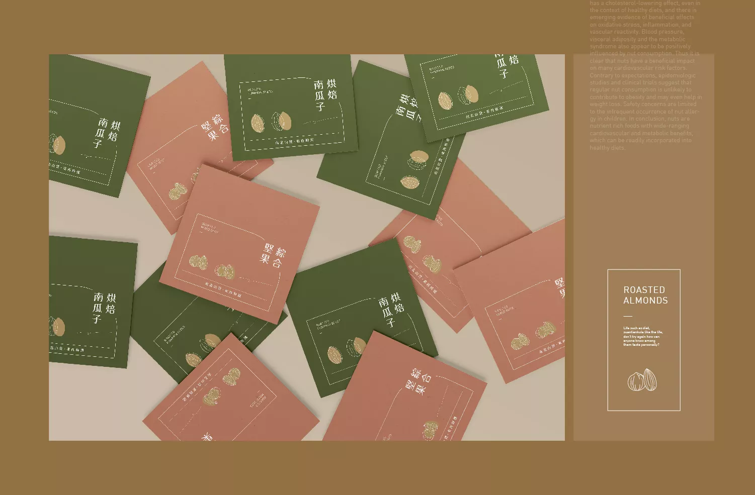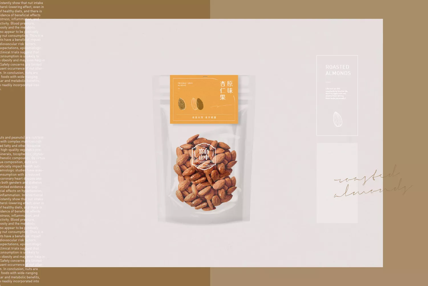 The packaging design for the nuts product line utilizes hand-drawn contour lines to the sketch the shape of the nuts in combination with hot foil stamping color blocks in order to highlight each product line’s unique characteristics. Furthermore, taking into consideration the various color changes of the roasting process into the color scheme, such as brown for the pecans, dark green for pumpkin seeds, and light yellow for macadamia nuts, the brand design emphasizes the details in the design and enhance the visual impression of the packaging.