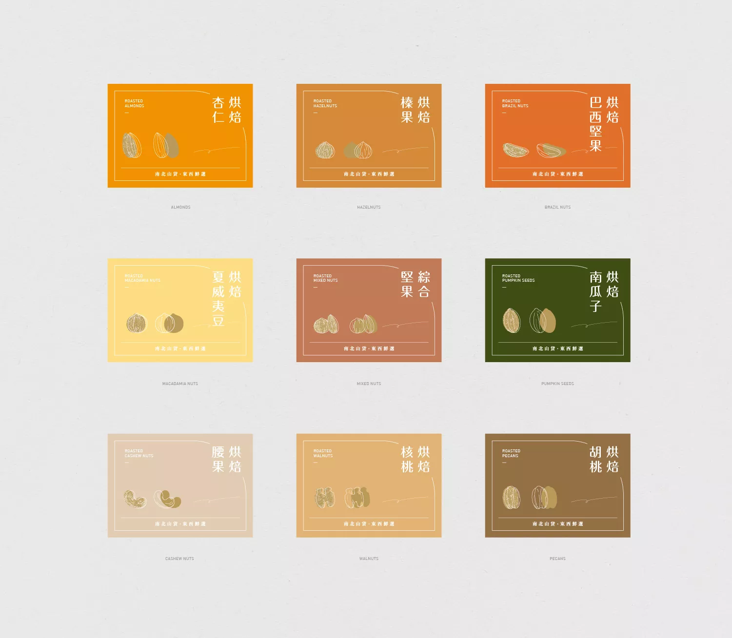 堅果包裝設計,以手繪線條勾勒堅果外型,融合燙金的色塊方式,凸顯每項堅果品種的略微不同,也在色彩規劃部分,帶出堅果烘焙過程中的顏色變化,如深咖啡的胡桃堅果、墨綠色的南瓜子、淡黃色的夏威夷豆等,使產品整體設計更加鮮明,提升包裝的視覺印象與感受。