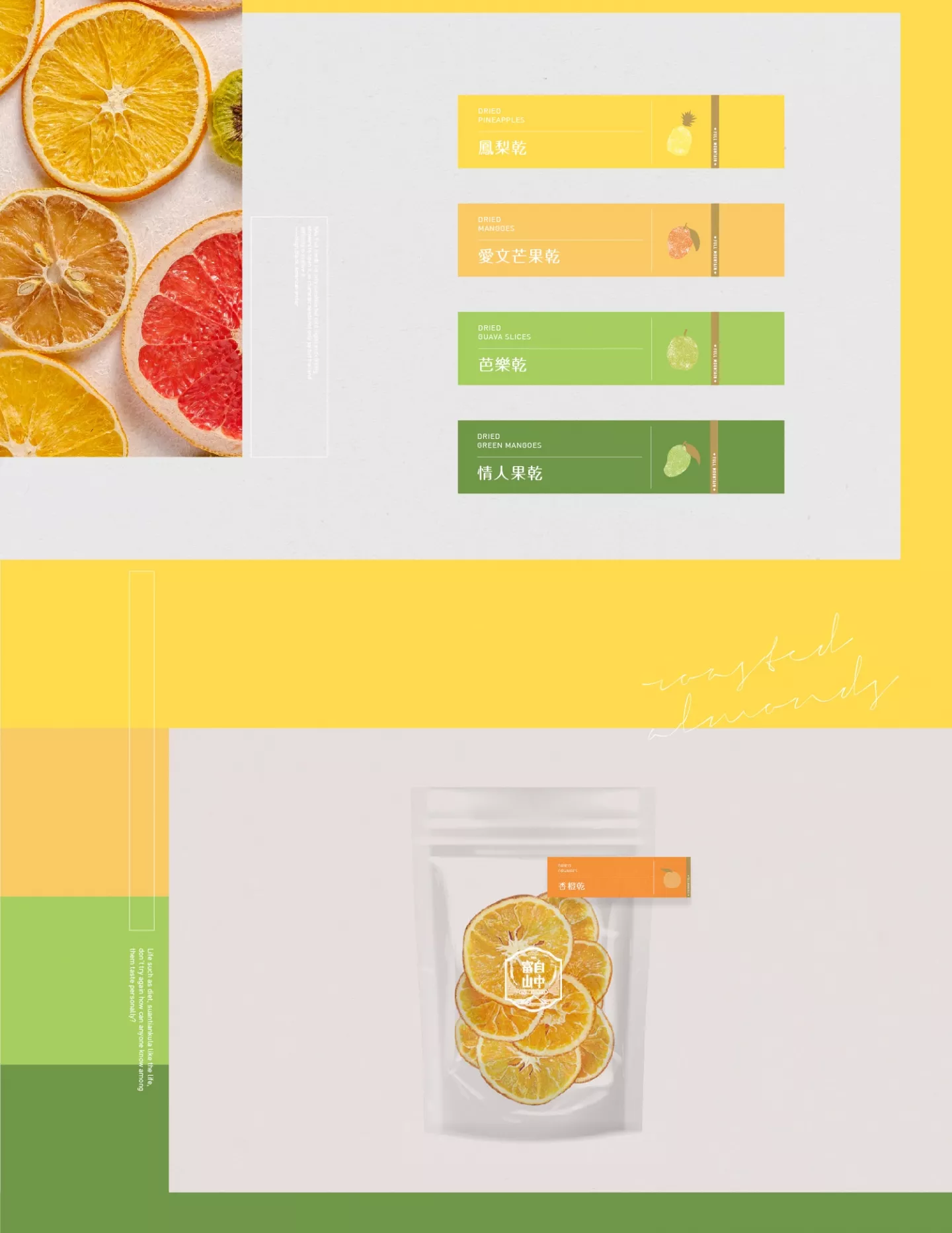 果乾包裝設計,選用白色霧面夾鏈式袋型,logo印白設計與包裝中間留空規劃,可從袋子外表看出食品本身,增加消費者的食用安心度。貼紙設計點綴整體包裝,以果乾口味區分品項,運用產品本身的原始色,如鳳梨乾、情人果乾等品項,使包裝色彩與貼紙相互對應,加深產品與包裝的連結性。